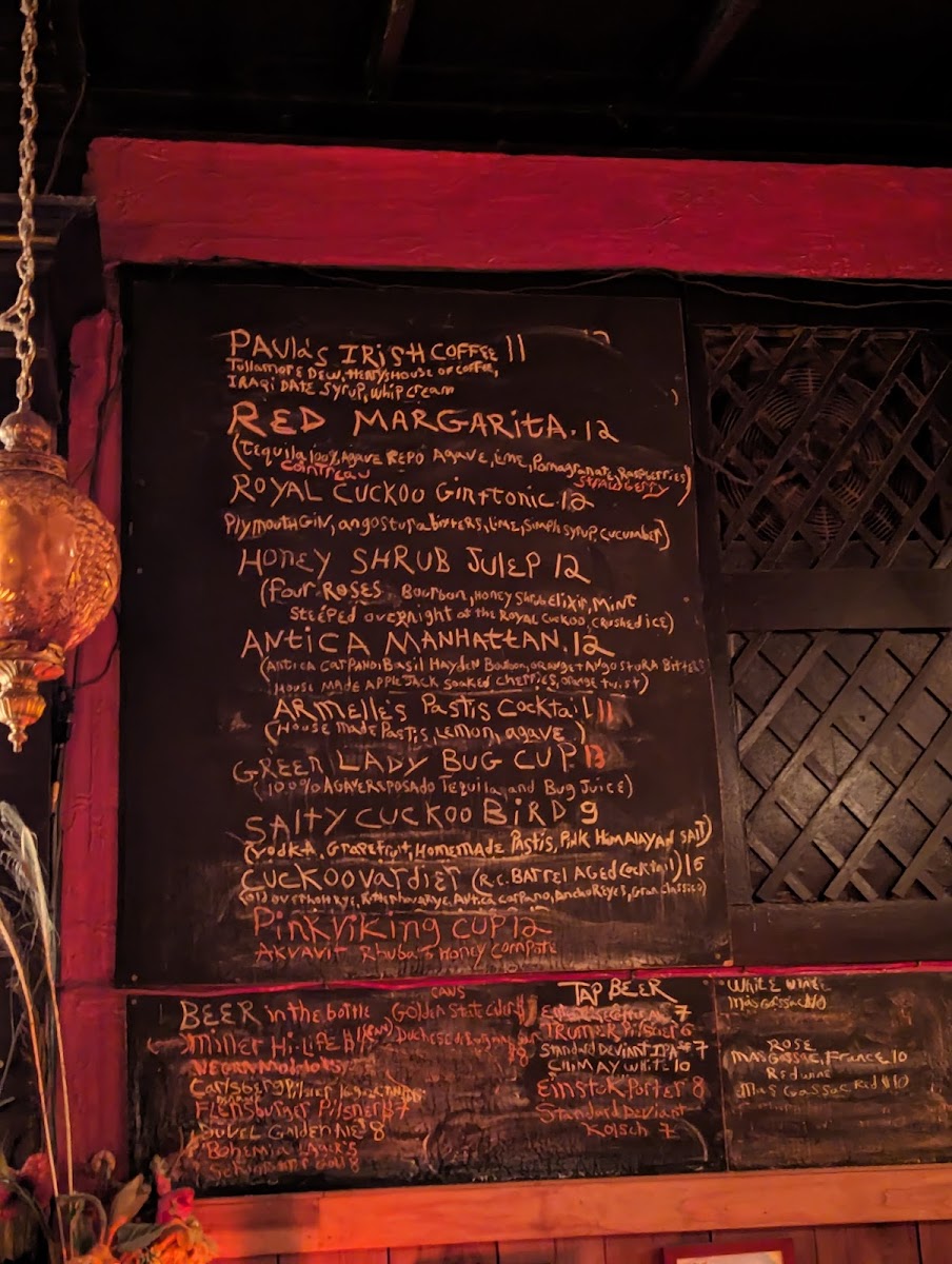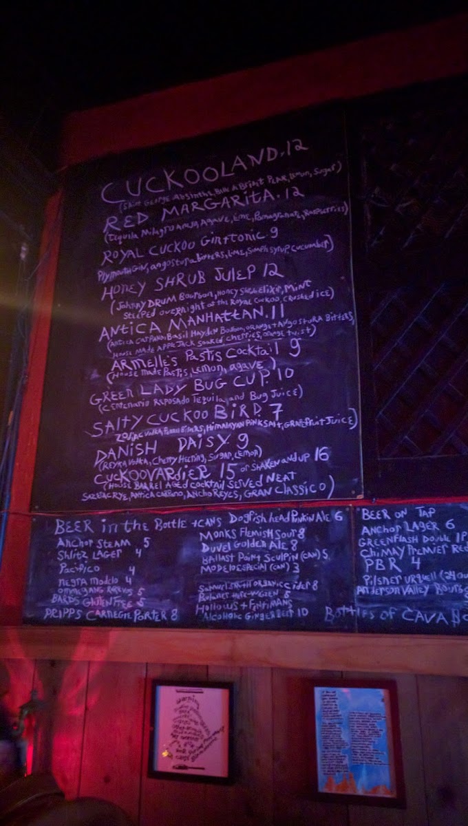 Expect to find a variety of beers both on tap and in bottles, from local favorites like Anchor Steam to carefully chosen imports and craft brews. Alongside these are specialty cocktails such as the Red Margarita, Honey Shrub Julep, and the uniquely named Cuckooland, featuring distinct house ingredients and balanced flavors.