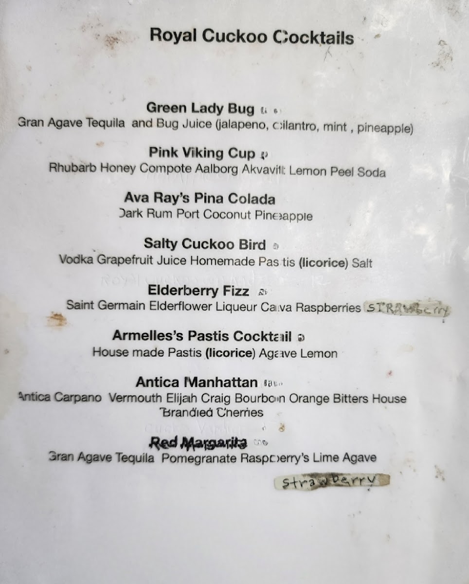 The Royal Cuckoo offers a thoughtfully curated menu that blends casual bar staples with carefully crafted cocktails. The selection leans into comforting drinks and approachable bites, making it a fitting complement to the bar’s intimate, vintage-inspired atmosphere.